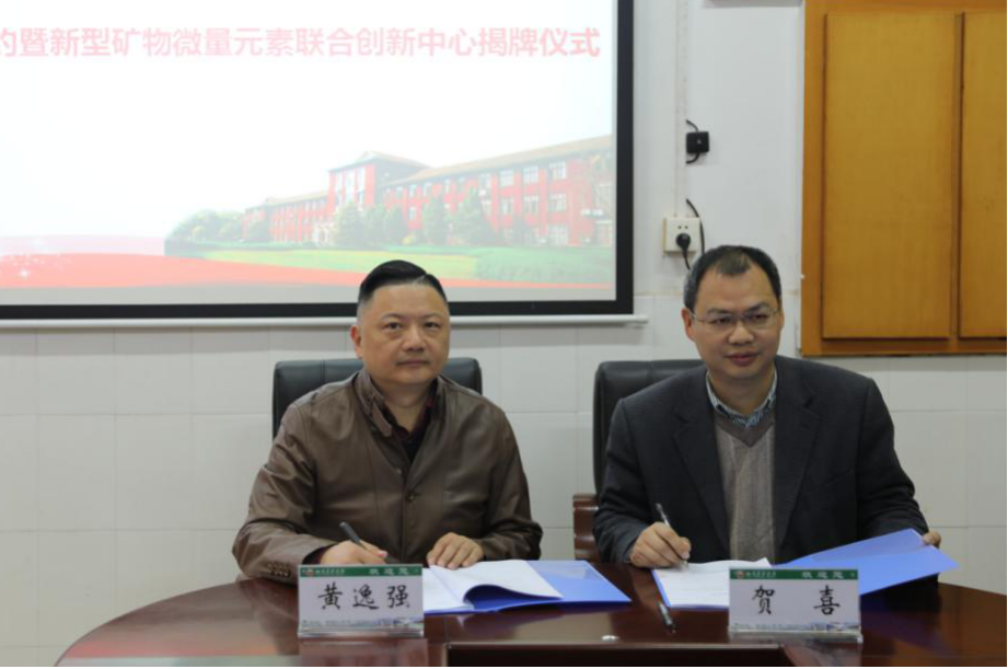 会议最后,在参会人员的见证下,校企双方领导共同签订校企合作协议,同时为新型矿物微量元素联合创新中心揭牌,并合影留念。