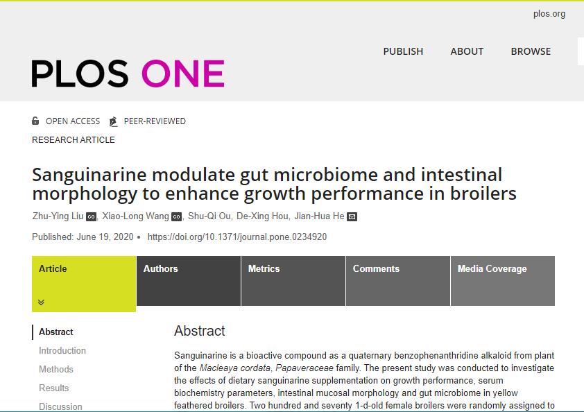牛膝多糖(achyranthes bidentata polysaccharides, ABP)是从牛膝根中提取的一种多糖,诸多研究表明牛膝多糖具有抗肿瘤、免疫调节、降血糖和抗衰老等多种生物学功能。血根碱(Sanguinarine,SA)是主要从博落回中提取的生物碱,具有抗菌、抗炎、抗肿瘤、增强免疫力及杀虫等作用。新浦金官网贺建华教授课题组前期研究结果表明牛膝多糖和血根碱作为植物提取物,在黄羽肉鸡的应用上表现出了促生长、防腹泻、提高免疫力和抗炎的效果。